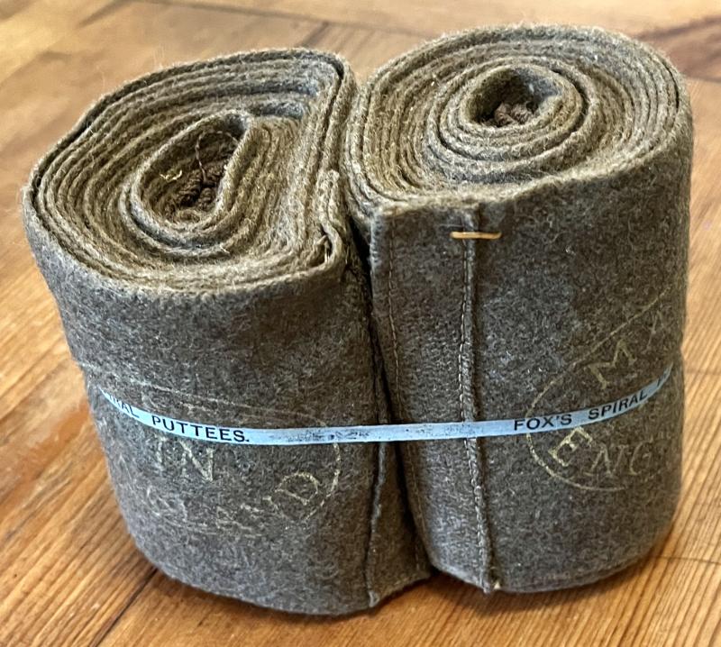 Mint unused long puttees from the Great War period. Still tied together with Fox mkd. cord. Left and right brass tags both present. Rare to get a Sleeper like this. Mint