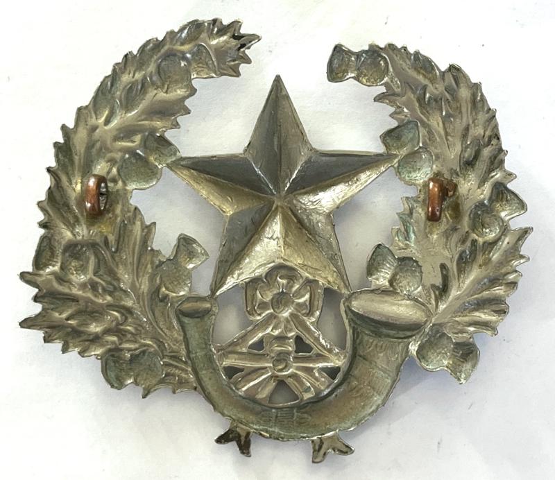 Regarded as the 2nf Btn. cap badge. Broad thistle wreaths. W/m. Shaped niceley for wear . Age toned , no rubbing or damage. Good looking badge, V.G.C.