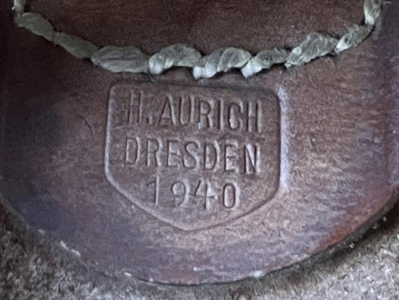 The buckle itself has the bulk of it's shiny blue paint and it's leather tang, this with Aurich Dresden clear stamp and 1940 date.