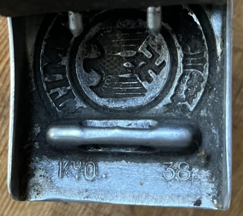 Pebbled aluminium buckle , 1938 dtd. and maker mkd , "K ü Q" ( Klein & Quenzer , AG, Idar-Oberstein ).