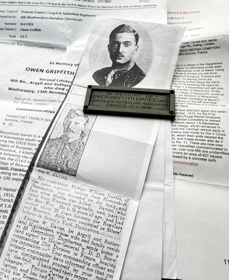 Very clear details, " In Memory of Owen Griffith Davies, Lieut. Argyll And Sutherland Highlanders - France , 15 . 11. 1916 ".