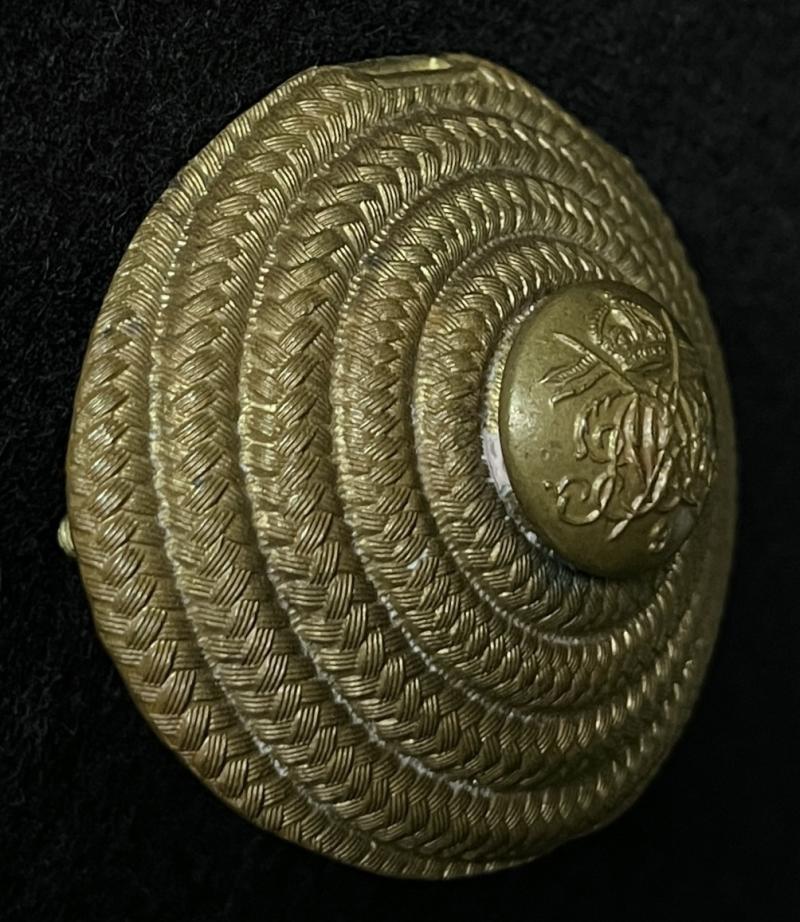 Circa WW1. Plume holder boss for the Lance cap. Round brass with a button to the front. Slot for the plume holder. Correct rear fixings. V.G.C.