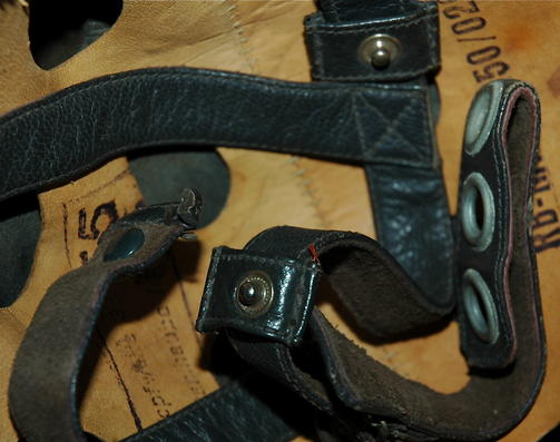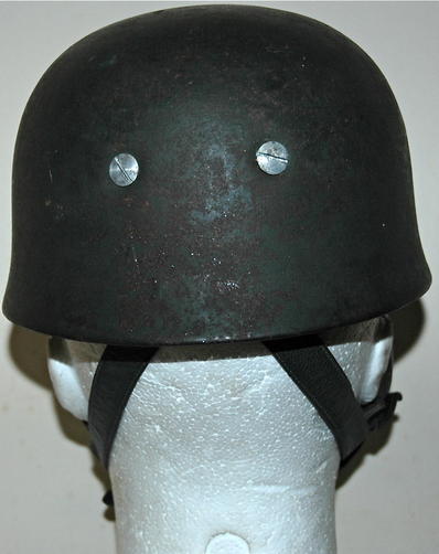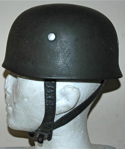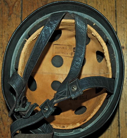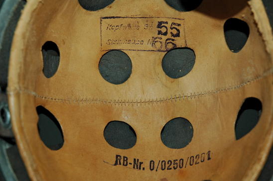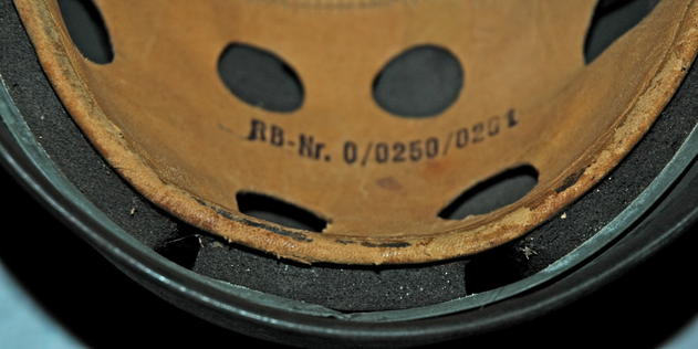 A great example of a late war paratrooper helmet. Field grey paint to almost 100%. Slotted aluminium bolts. Good size 55 RB numbered liner retaining it's bright tan finish. Good condition blue jump straps with flower motif to stud. Sorbo type rubber very good and supple. No makers mark but there is a faint stamping "4305" ? Lovely clean helmet rarely available in this condition. Posted on Wermacht Awards Forum by previous owner.
