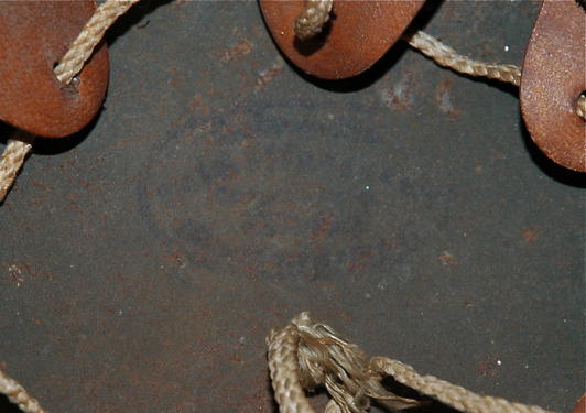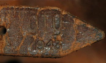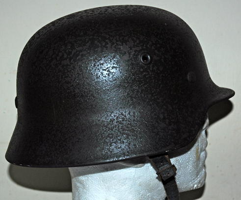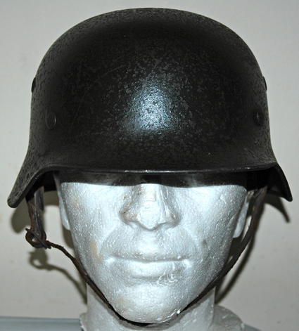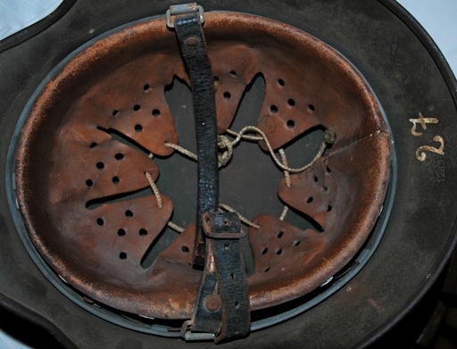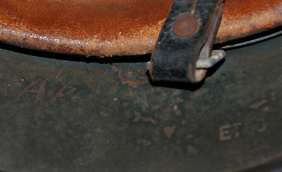 A total original I just got from the loft of a house in Wales. ET 64 shell. Owners initials "A.P." scratched to apron and white "27". Good liner. Maker marked and dated chinstrap "GTO -1943". Good decal. Dome stamp in crown. At least 50% of original field grey paint.