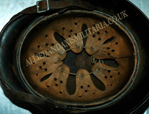 Tan/Maroon/Green camo with rough sawdust finish, this has been applied while the paint was wet giving it a rough textured finish.Good size ET64 shell. Good liner with soldiers name applied in ink. Original marked and dated chinstrap. None nicer, name of the L.A.C. who served with a Typhoon squadron in Normandy and brought it back will be given to buyer.