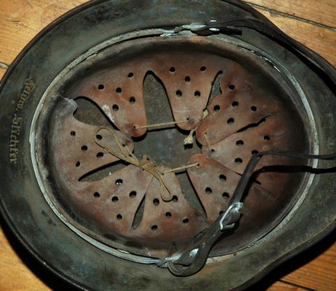 Straight out the woodwork " Been There" one look helmet. Grey /green camo with rough textured sawdust finish. Size 66 . Named in rear apron. All original. Photos speak for themselves. Get in quick , helmets like this don't hang around long