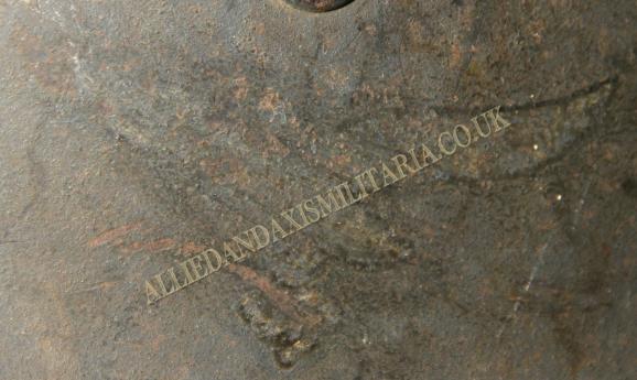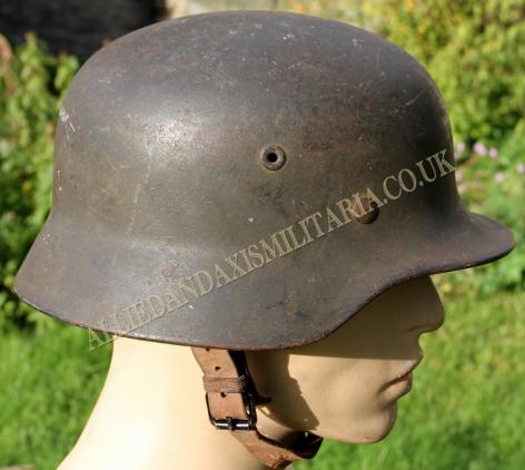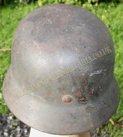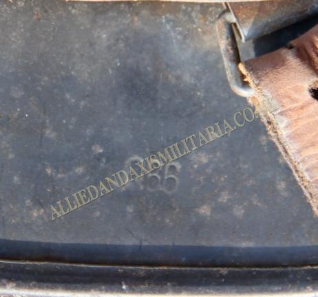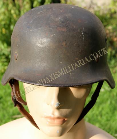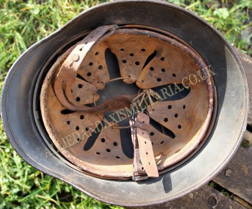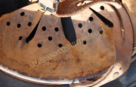 Good very heavy helmet retaining most of a field grey overpaint as done by the Field Divsions. Inside retains it's Luftwaffe blue paint. 2nd pattern eagle visible below camo paint. Large size 66 with batch number 248.Single banded liner band. Good liner with all tongue ends good and original drawstring. Soldiers name "Dr. BAHN".Possibly doctors helmet ? Unusual original chin strap with Luftwaffe roller buckle with leather flap behind.