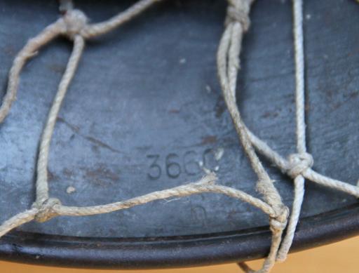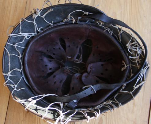 Superb all original combat helmet with an original to it string net. ET 64 shell with batch no. 3660. Nice hair oil darkened liner with all tongue ends intact, one small rodent bite to leather.Double banded liner band with square D rings. Original maker marked. and dated chin strap "M &..kampmann - .ppert..e - 1937". Aluminium buckle. String net in good condition with a few breaks.
