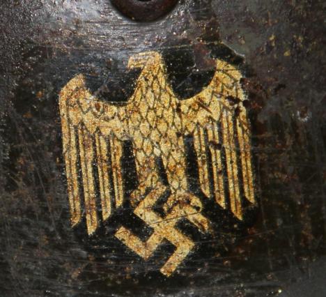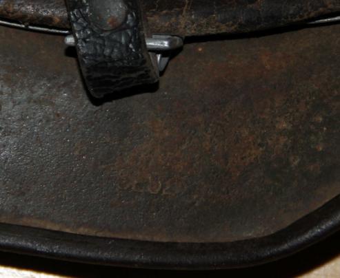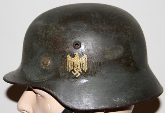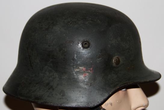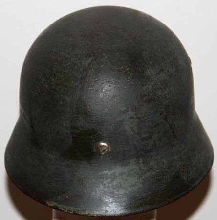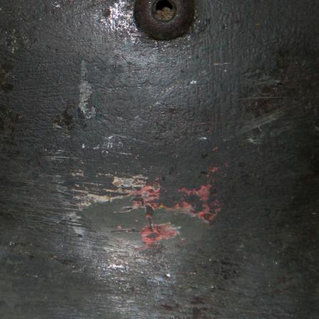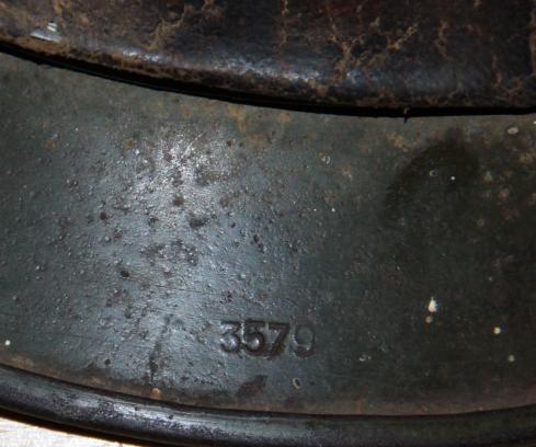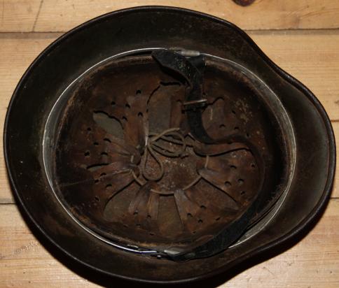 M35 helmet with one of the best Army decals I've seen in a long time. Almost 100%, nicely toned to a nice golden colour but this is not a Kreigsmarine. Remains of state shield, partially scraped off as per the decal drop directive of 1940. Early smooth paint but has the remains of a green camo overpaint. Early single banded liner band with square D rings. Liner good but with some rodent nips to two tongues. This is not very noticeable. Nice original numbered chin strap.