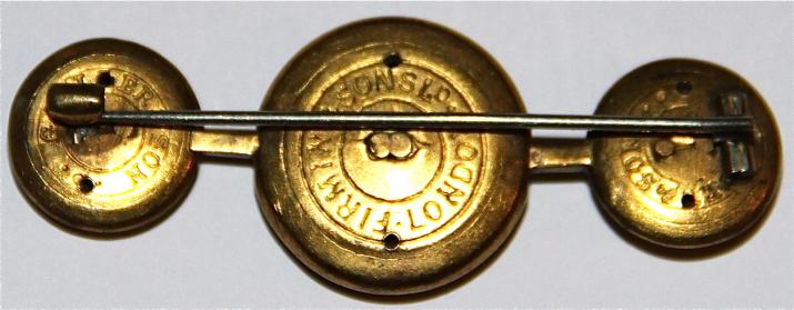 Beautiful bar brooch made from 3 gilded buttons professionally mouned on a gilded bar with stout original hook and pin. The 2 outer epaulette size buttons have 3 anchors and "R.Y.S." in old script. The centre large button has "R.L.Y.C." and is surmounted by a Victorian crown.