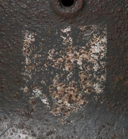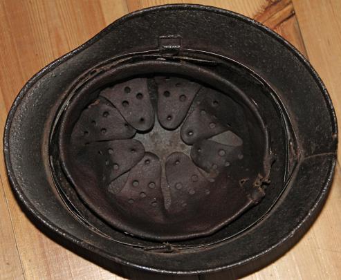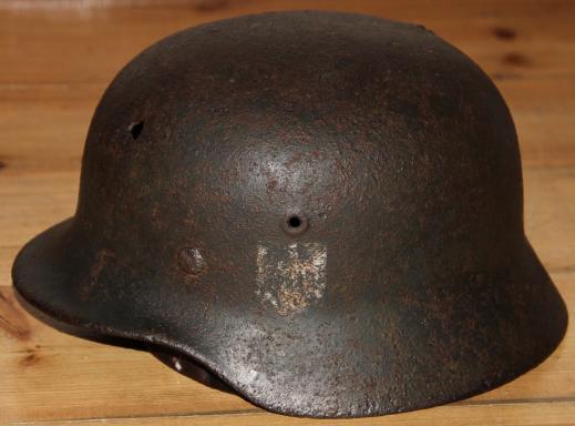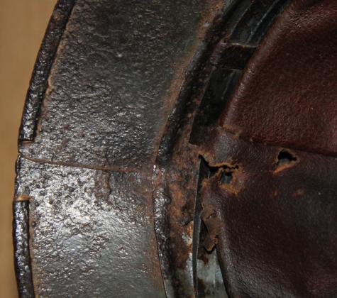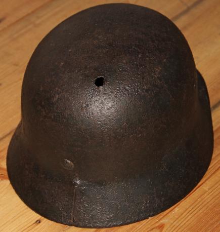 Good solid battle field recovered helmet found in Hungary. Retains a large percentage of original smooth paint finish. Army decal to around 50%. Liner present but detached. A bit shrunken but with holes, which correspond with the two entry holes on the shell as well as the strike on the rear apron. Original liner band.