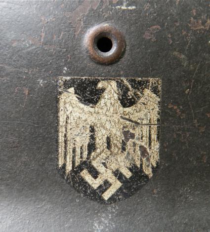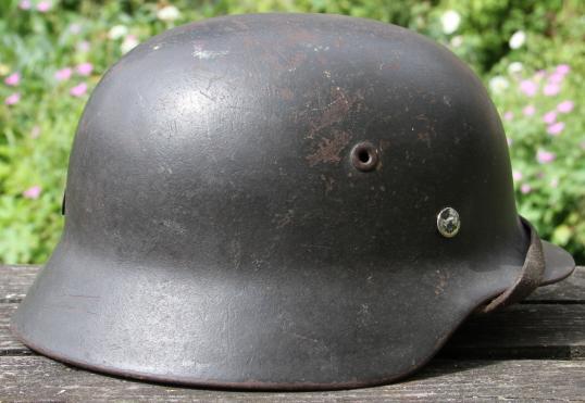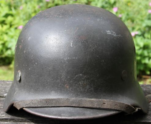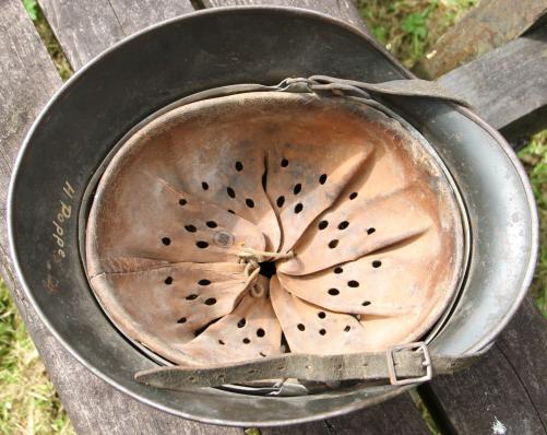 All original NS64 D series helmet with good army decal with some slight surface abrasions. Most field grey finish present to shell. Named in rear skirt and also in the liner. Liner complete and very good with honest service wear comensurate with the rest of the helmet. One helmet pin a period replacement ? Full length maker mkd and 1940 dtd. chin strap. Maker looks like "....LRINGHAUS & CO - ..L...HEIM".