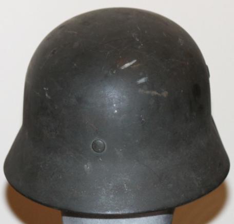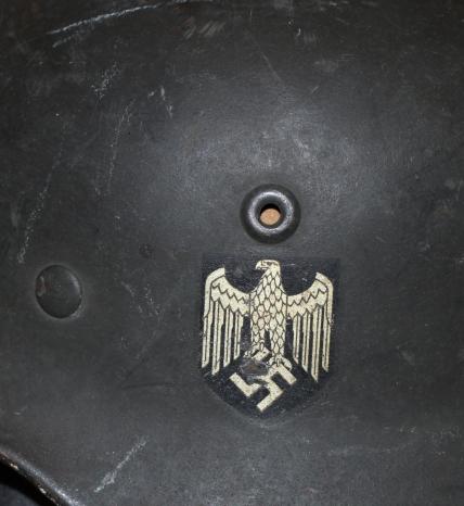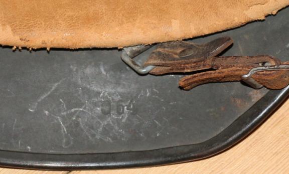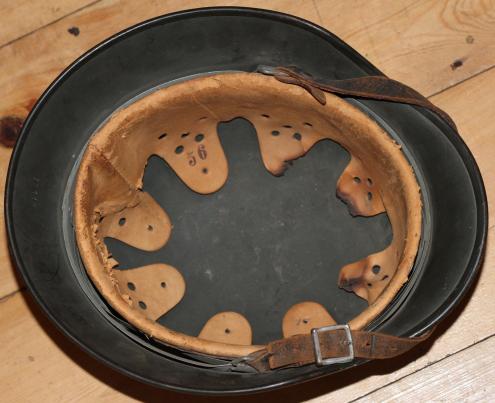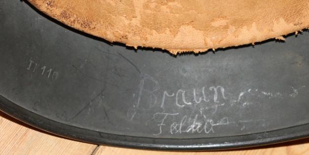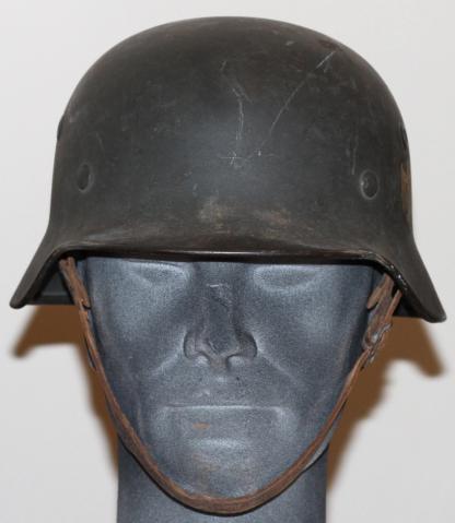 A superb all complete original combat helmet retaining almost all it's original matt field grey paint. This one is what's called a wartime re issue, i.e. updated with matt paint , re decalled in some instances and issued again. Interestingly, the decal has been applied on top of an earlier one which can just be made out on close inspection. The decal is a stunning looking army which has toned to a golden colour but in my opinion is not a Kreigsmarine. Q64 and batch no. DN 116. Good liner with 3 tongue ends slightly a/f and dark which is usually blood so this guy possibly had a head wound. Original steel buckle chin strap, good but with tip of the long section absent . Owners name " BRAUN FALKO " applied to apron.