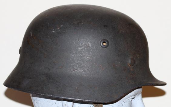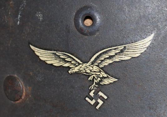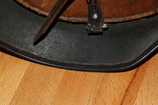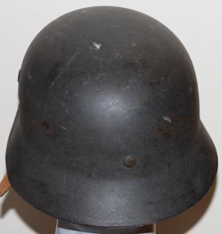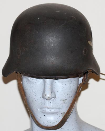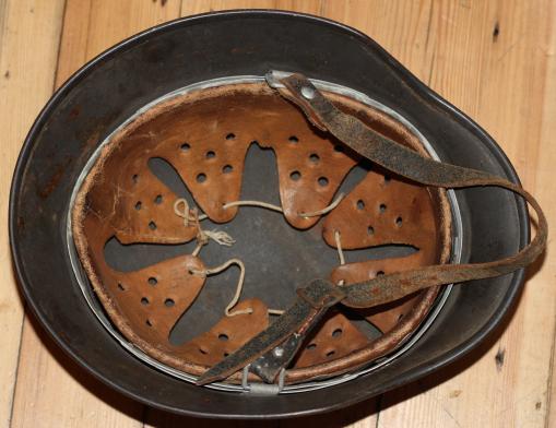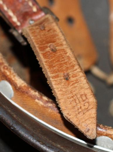 As nice as they come. Beautiful " One Look" helmet. Rough texture blue grey paint to almost 100%. Lovely toned decal, complete apart from one small nick out the centre of the swastika. Q64 shell,batch no. indistinct. Nice size 56 liner with original draw string. Original to helmet full length steel buckle chin strap marked, DLO 42 to end. Liner band is the scarce double banded aluminium but with steel D rings.
