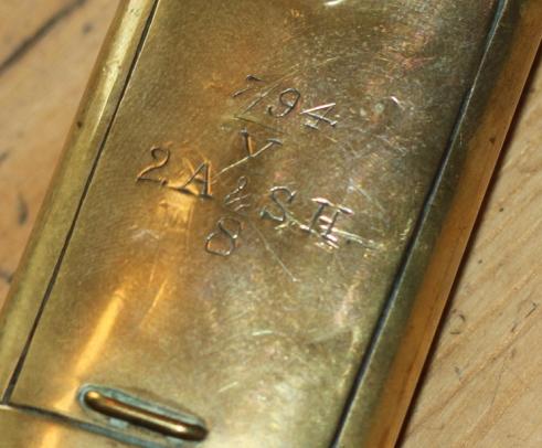 Etched to back of top scabbard mount " 7/94 V. 2 A & S.H. - 8"