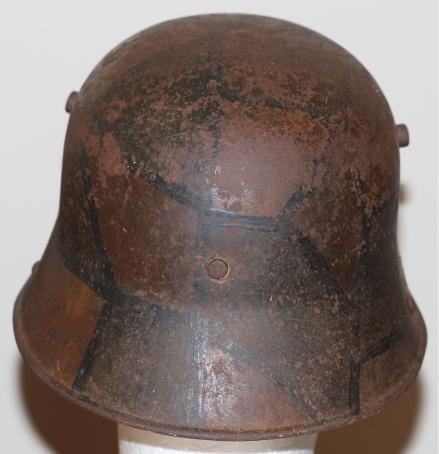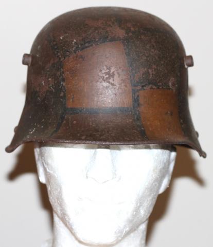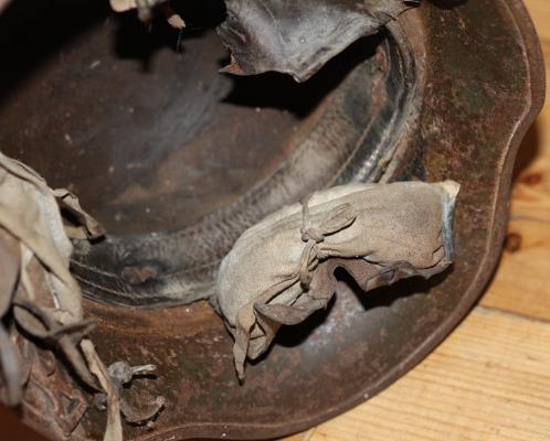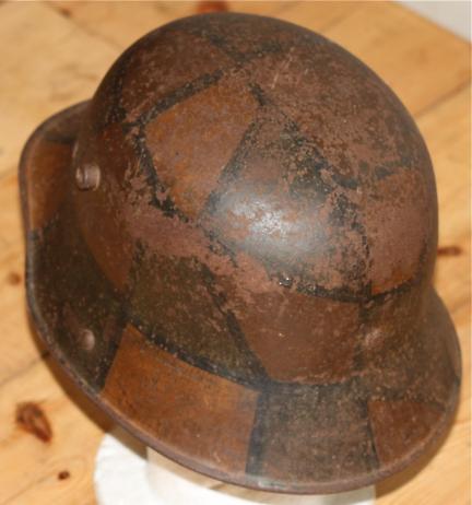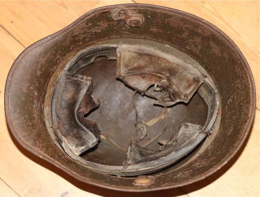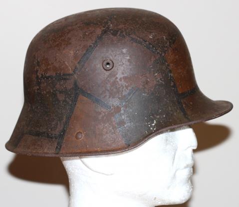 Straight out the loft and in times when most camos out there are fake it's nice to get a 100% original. 3 colour block camo of green /ochre / reddish brown and correctly broken up with finger width black lines. Leather liner band. 3 pads present, one still with it's horsehair cushion. These are still in good condition for their age with 4 tongue ends still intact. Unusually the leather draw string is still present.Strap ends present. Large size with non stepped air vents.