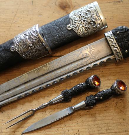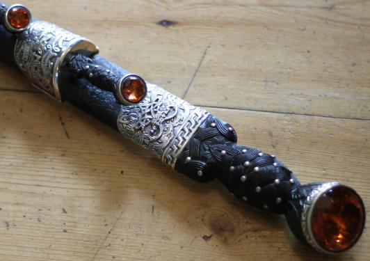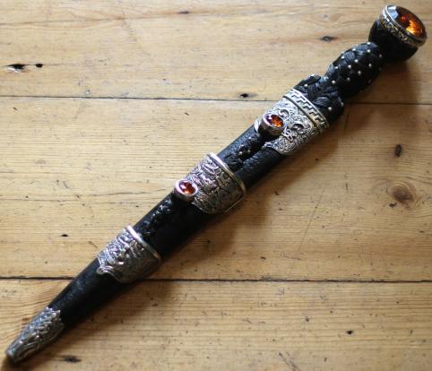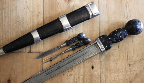 Leather bound scabbard good.Knife and fork have some silver studs missing otherwise this dirk is near perfect and certainly the best ever to pass through my hands.