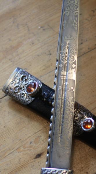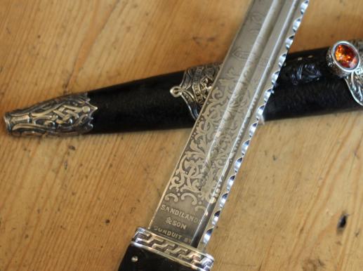 Maker mkd. " SANDILANDS & SON, CONDUIT ST W.". This to the beautiful acid etched blade which has to one side the Argyllshire Boars head and " NE OBLIVSCARIS" and to the other side the Sutherland Wildcat and " SANS PEUR". Clipped back stout blade.