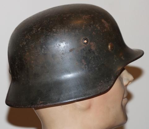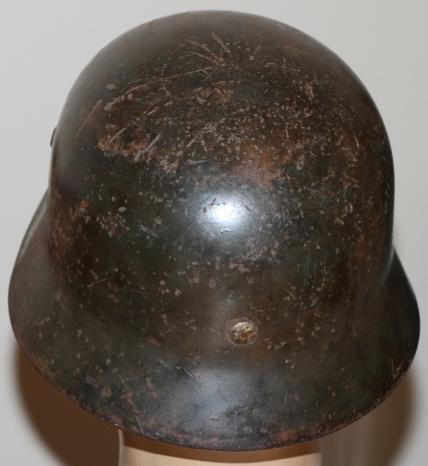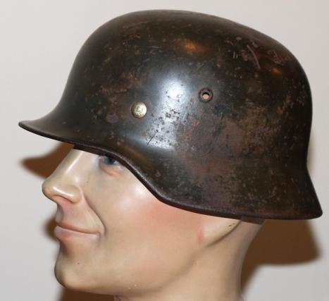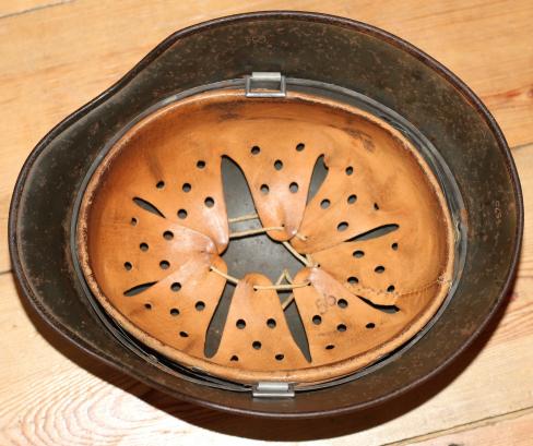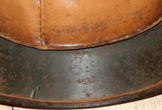 Good early helmet still with it's shiny parade/early finish. Batch no. 4575. This is one of the helmets referred to ass " Oddball" in the Brian Ice helmet book, i.e. this one has a zinc liner band fitted with earlier aluminium D rings, a known though scarce configuration. Brass helmet pins.Also at this time helmets were leaving the factory in both shiny and matt paints. This is a great helmet with a very nice condition size 56 liner named to it's former owner . Evidence of it's army double decals, the state shield having been scraped off as per the 1940 decal drop directive.