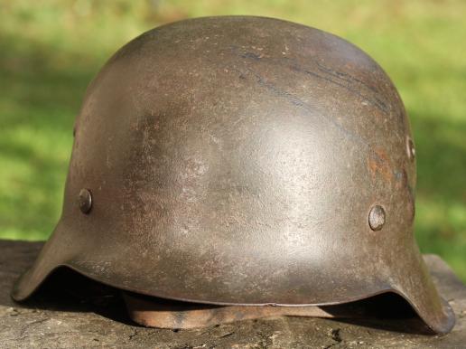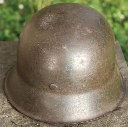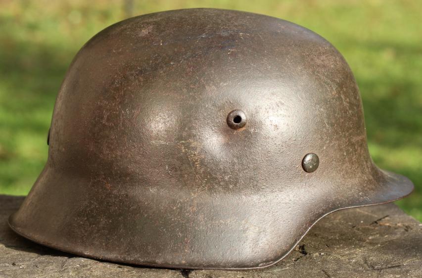 Good complete battle field pick up combat helmet. Small calibre bullet strikes which have come from the inside and have impacted on the shell with resulting outward dents, most likely from a pistol. Corresponding holes to liner. Also another bullet strike to the outside below the right air vent. Evidence of blood in the liner.