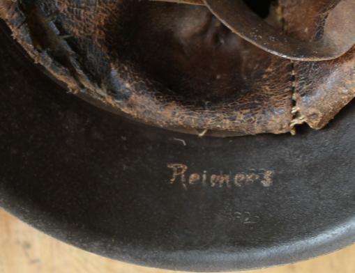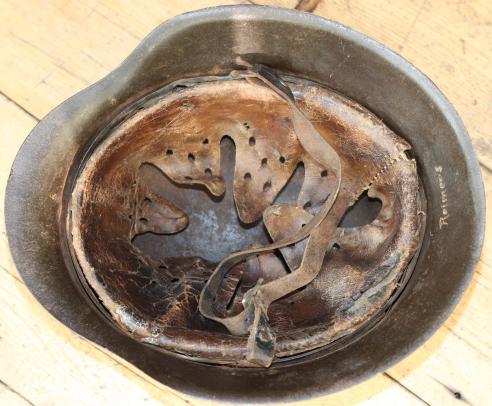Liner leather good, full length chinstrap.Owners name in Gothic script to rear apron "Reimer".