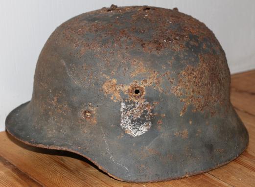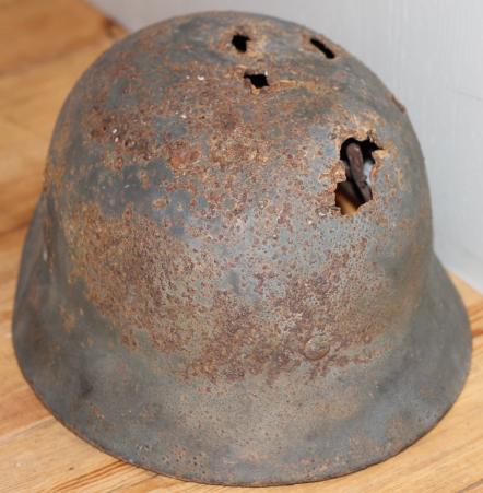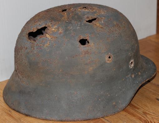Leaves no doubt as to the ferocity of the fighting.Battle damage is exit holes and even the chin strap buckle has taken a strike.