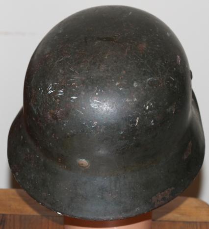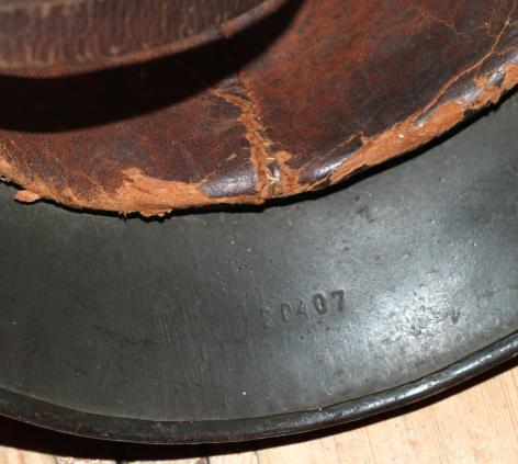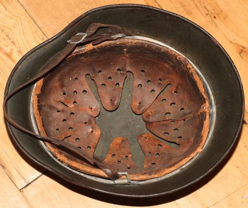 Straight out the woodwork from vets family. Huge size EF 68 with lot no. 20407. Size 61 marked to liner. Shell has the early smooth paint which is scarce as most helmets of this vintage were re issued with matt paint. Very good army eagle and state shield also good with the crazing I like to see on genuine examples. Liner good with all tongue ends complete although a little dry and with some wear to lower edge.Soldiers initials applied in ink. Different colour to helmet pins which is not uncommon, pins the early type with markings. Double banded aluminium liner band with square D rings.This nice and tight and has never been removed. This helmet came without a chin strap, I have shown it here with an appropriate strap which is not included in the price.