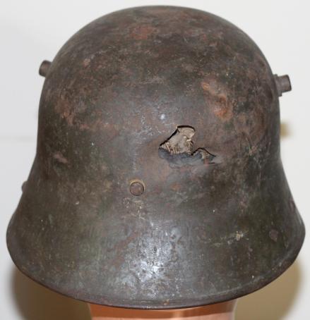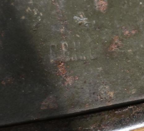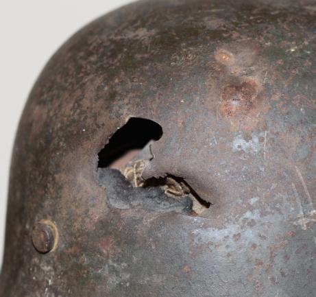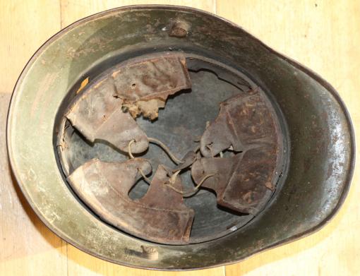This one has sustained battle damage with a shrapnel strike to the rear crown. It also looks like someone has then put 4 pistol rounds into the poor chap as there are outward dents with corresponding holes through the liner. The liner surprisingly is good with all 3 pads and leather band, one pad still with it's cushion and still with it's original draw string.