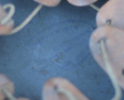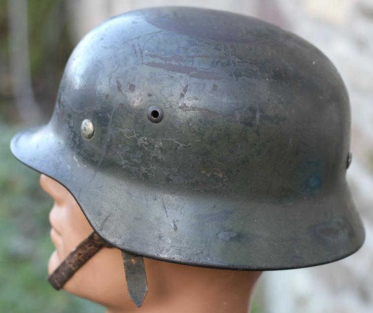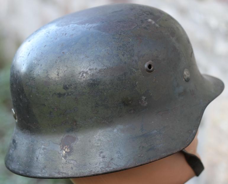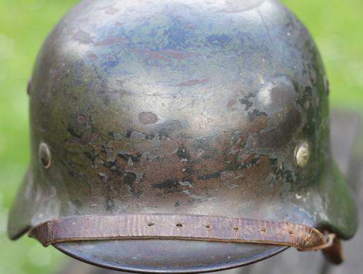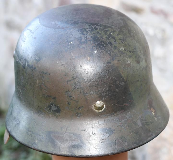 This one is confirmed in the Brian Ice book on helmet codes as having left the factory in 1939 as a double decal Luft with 2nd eagle and dome stamp. Both decals visible under the camo which is green & maroon spray of the type referred to as a Normandy. I must say in my experience this camo crops up in various theatres.Nice clear dome stamp. Original Luftwaffe blue to inside. Very good original sheep skin liner still with it's drawstring.