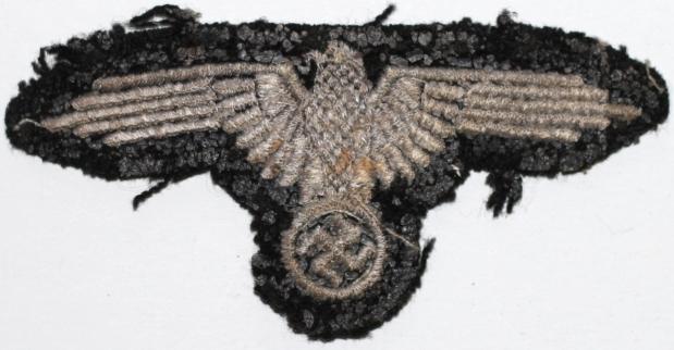 Superb embroidered SS sleeve eagle. Removed from uniform and swopped for cigarettes in Hamburg by SS man P.O.W. with Trooper Spence of Edinburgh, 1st RTR ( 7th Armoured Div. Desert Rats) who was involved in the push on the city.