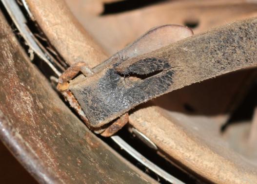 Quist Big Foot decal, nicely toned with no issues. Good sheepskin liner on zinc band, c/w draw string. Original chin strap present with steel buckle. Short end good, long end with end section absent and tear at the stud end.