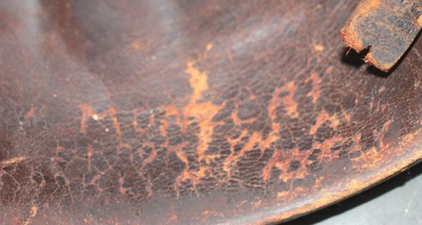 Good hair oil/sweat darkened liner , this with owners name and possibly unit details scratched into the leather. All tongue ends good and still with it's original draw string.