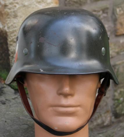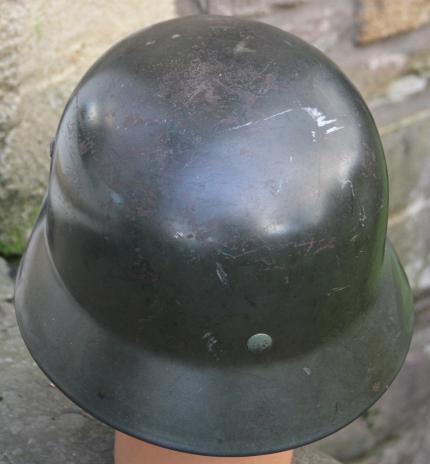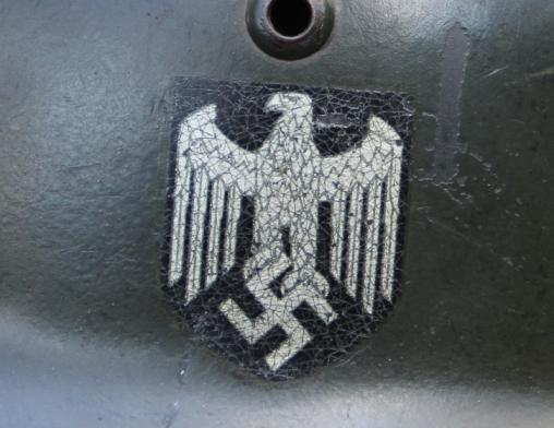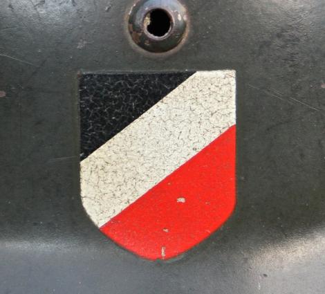Rare early helmet in a large size. Early smooth paint to 95%. Excellent Wermacht Adler and State shield. Both are as nice as I've seen. The eagle decal is almost 100% and still very bright. State shield has some nice slight age crazing and is almost 100%.