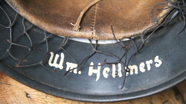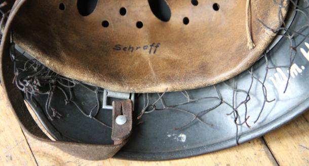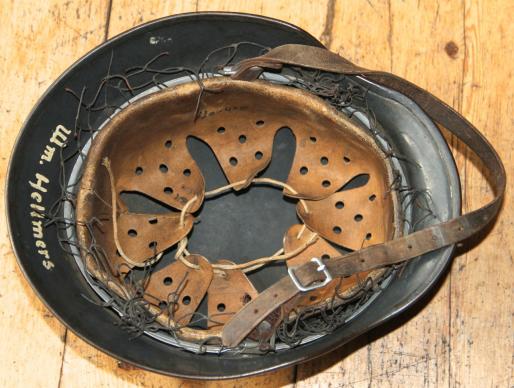 The liner is in really good condition , size 56 and of the type using the early pre war tanning process. Named to " SCHROFF ". Early double banded aluminium liner band with square D rings.Original draw string to crown. Nicely painted name in rear skirt, "Wm. Hellmers ".