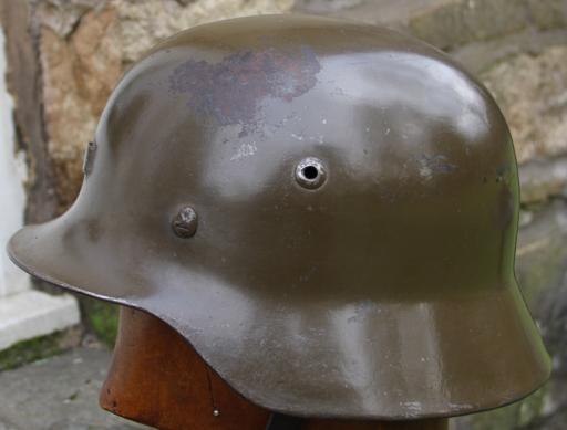 When the M1935 combat helmet went into production in 1935, units of the German Army (Heer) and Air Force (Luftwaffe) eagerly awaited the finished product. Much to their dissatisfaction, the first shipment of completed helmets did not reach their units until 1936. This delay, in part, was due to a number of large foreign orders that took precedence over the requests of the German Armed Services (Wehrmacht). It is important to note that German firms produced the M1935 helmet for foreign export prior to World War II. The largest of these shipments were sent to the Chinese and Spanish governments. While virtually identical to the German issued M1935, most of the exported helmets did not have the same type of liner systems found in Wehrmacht issued helmets. In addition, the majority of foreign export models were not stamped with production code numbers and maker's marks like those found on original wartime era German combat helmets.