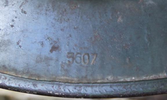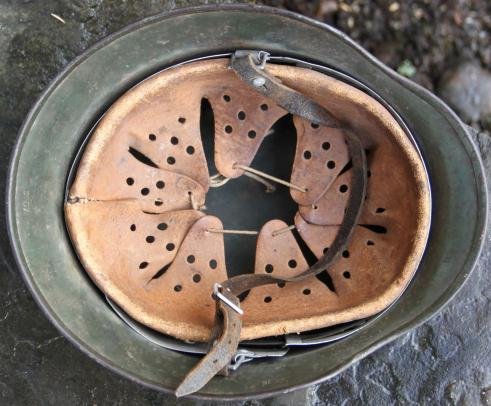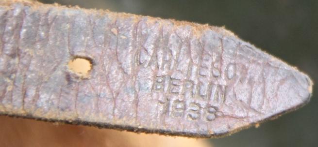 Still with it's scarce early issue single banded aluminium liner band, this as usual cracked hence the need for the later double banding. Nice sheepskin liner and still with the original draw string. Original to it aluminium buckle with Berlin maker and 1938 date, this in good supple condition.