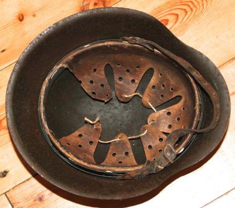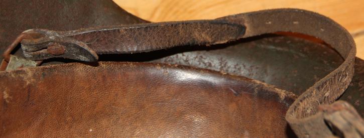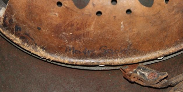 Named to soldier in ink and another name is part present next to the missing tongue so it would appear to have been issued twice. Original steel buckle chin strap with field repair .