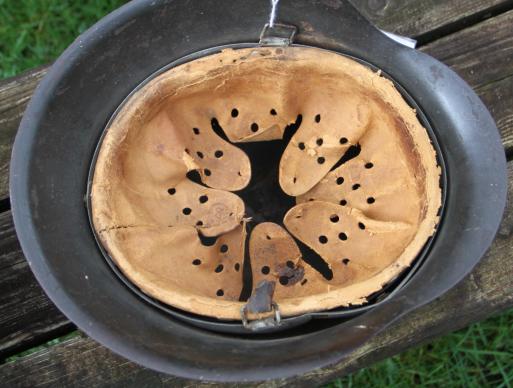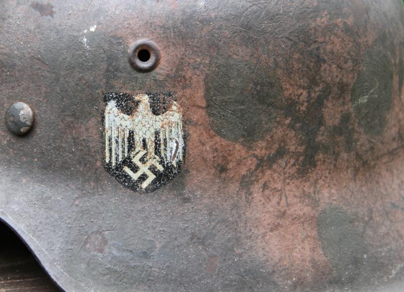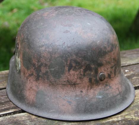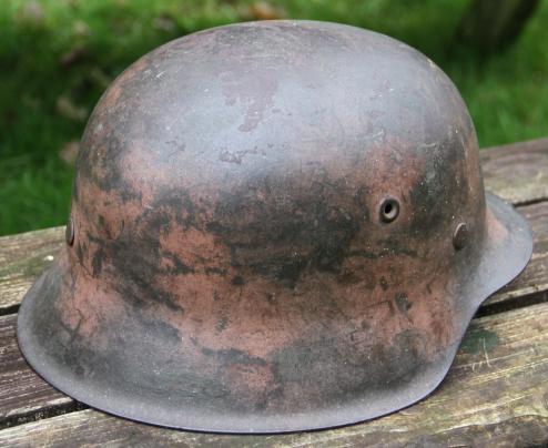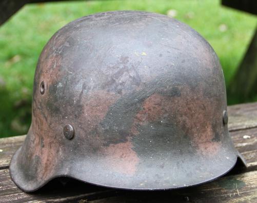 This one out of Michigan a few years ago and purchased direct from the vets family. Story goes it was taken from a pile of helmets from surrendering P.O.W.'s. Vet liked it because it was the only one with camo paint. He took the helmet and put it in his tank.Later the chin strap was utilised for a running repair on said tank.