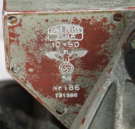 These stunning 80º elevation, 10 x 80 Kriegsmarine mkd. binoculars were made by Carl Zeiss Jena. The prototype was developed around 1938, and were considered a Sonderkonstruktion, or special construction, by Zeis.