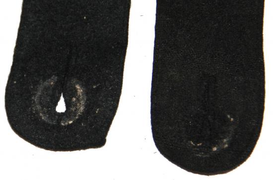 Black button on shoulder boards. Uniform removed and with some service wear. Impression of where the buttons have been. Interestingly, one is longer than the other however they have been worn as a pair with exactly the same commensurate age and wear.