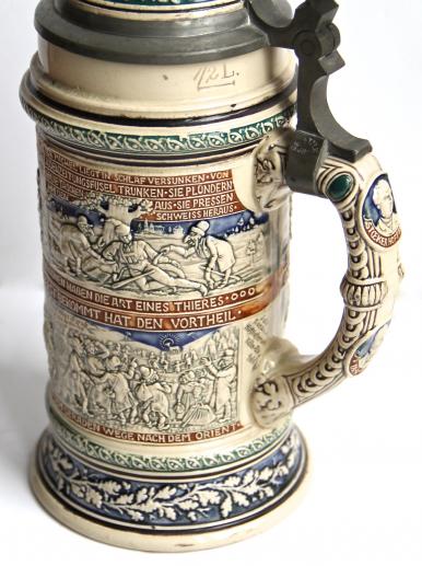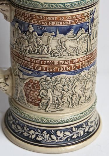 The scenes in relief on the stein show very much every negative quality of the Jews as they were often perceived at the time, including the saying "Trau keinem Fuchs..." (Trust No Fox...).
