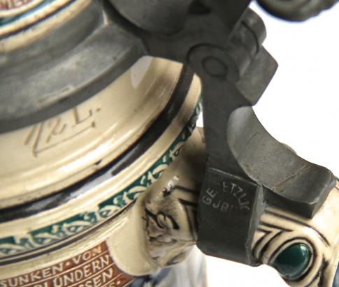 The manufacturer was Deumler & Beiden. There are two dates on the stein, 1893 and 1910. 1893 being the year in which the anti-Semitic party had a huge success in the Reichstag election and 1910 was the year in which the "Deutschvoel-kischer Studentenverband" was founded, a very antisemitic right wing party.