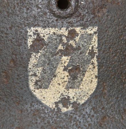 Good solid shell with some pitting but still with most of the original field grey paint. Good 2nd type Runic shield. One helmet pin absent. Liner band present.