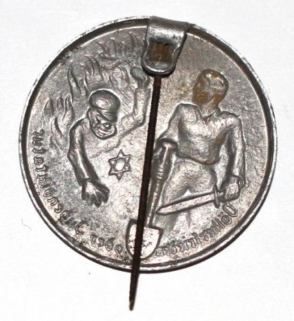 Scarce tinnie. Jew with whip and Aryan with sword and spade. Text translates to " A Peoples Peace or a Jewish Dictatorship ". Aluminium. Needle pin. V.G.C.