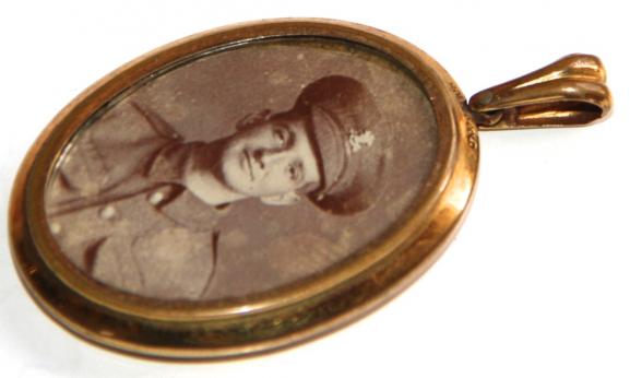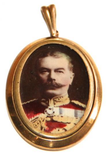 Beautiful gold locket with picture of WW1 soldier in o/r's uniform with peaked service cap. To the reverse a coloured picture of Kitchener.