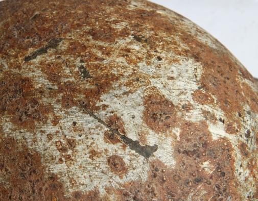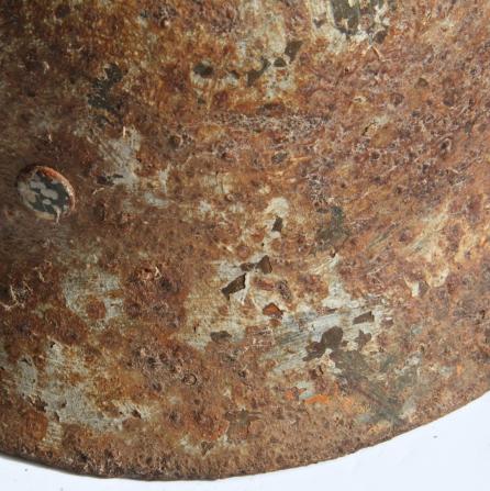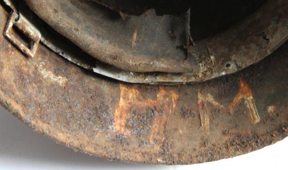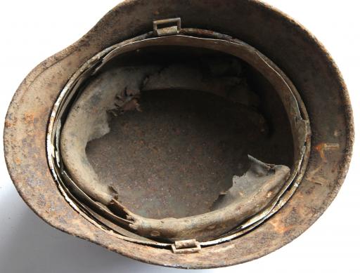 Snow camo winter warfare M35 with good solid shell, liner band and remains of leather liner. Recovered back in the day by Spin from the 290th Infantry Div. positions in the Demjansk Pocket.Outline of army decal to left side.