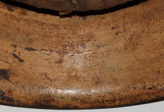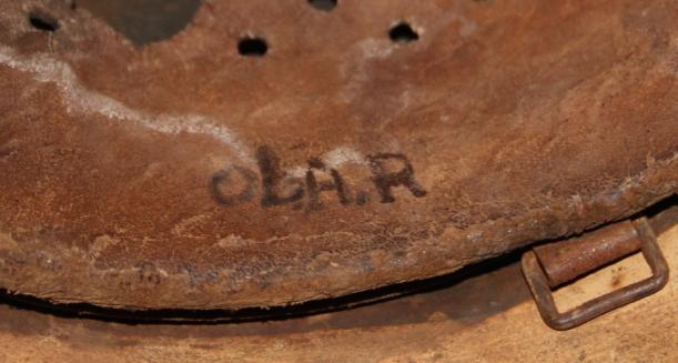 Dome stamp to crown. Large size 66 shell, CKL 66 - 5036. Size 58 liner, this a bit dry but all tongue ends complete and has the soldiers name " OLAR" applied in ink.
