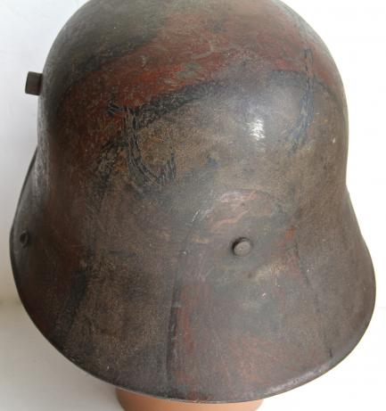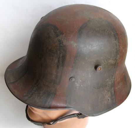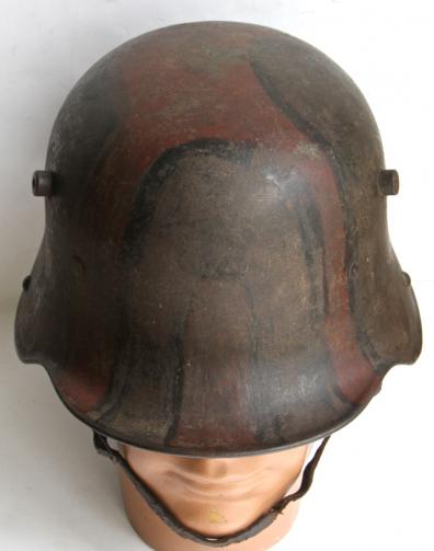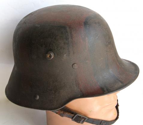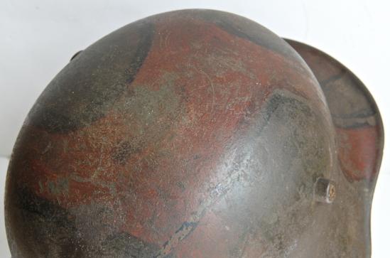 One Look original German WW1 trench helmet in an interesting 2 tone autumn camo of green and brick red with fine line black separation.