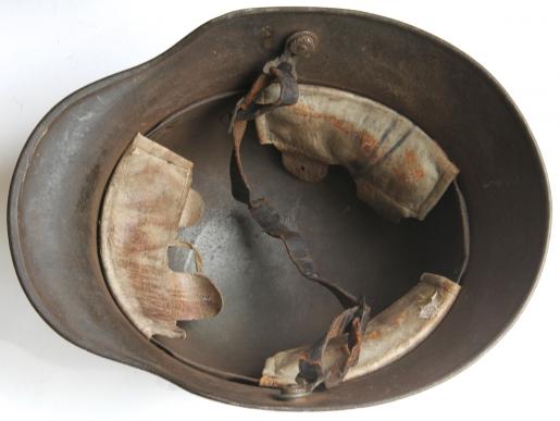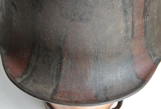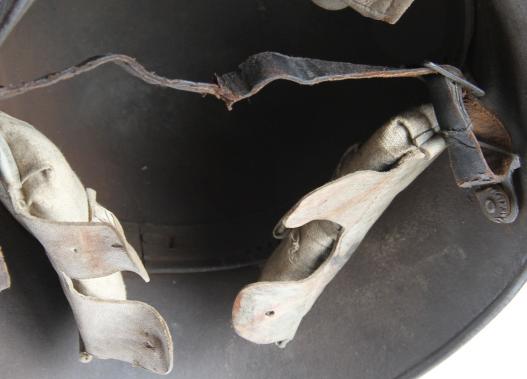 The helmet is complete. Chrome leather liner pads in good supple condition and with all tongue ends intact. Horsehair pads are there on 2 of the pads, the third has a piece of leather instead, this would appear to be period and as the rest of the helmet is sleepy so I have no doubts this is how it was worn.Metal liner band as per M17 configuration.