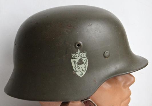 Now very collectable in their own right, this is a German M40 helmet re used by the Norwegian army post war.
